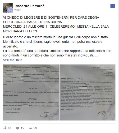 ”Soldatul necunoscut este un militar mort pe campurile de razboi, a carei identitate nu a fost niciodata cunoscuta. Mormantul sau este unul simbolic pentru ca ii reprezinta pe toti cei care au murit in diferite deflagratii. Asa ne-am gandit la aceasta necunoscuta, care merita sa aiba un loc de inmormantare”, a scris parohul italian pe pagina lui de Facebook.
