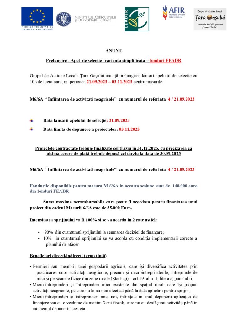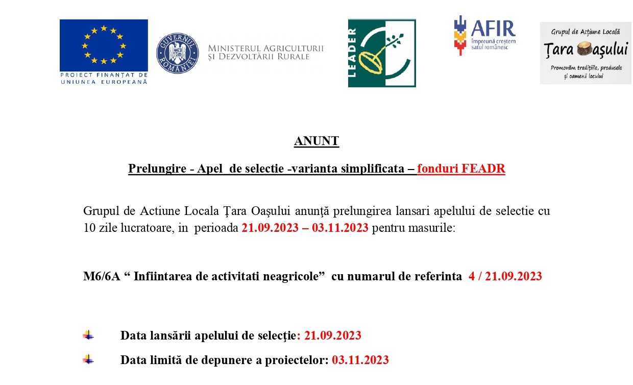 Grupul de Actiune Locala Ţara Oaşului anunţă prelungirea lansari apelului de selectie cu 10 zile lucratoare, in perioada 21.09.2023 – 03.11.2023 pentru masurile: