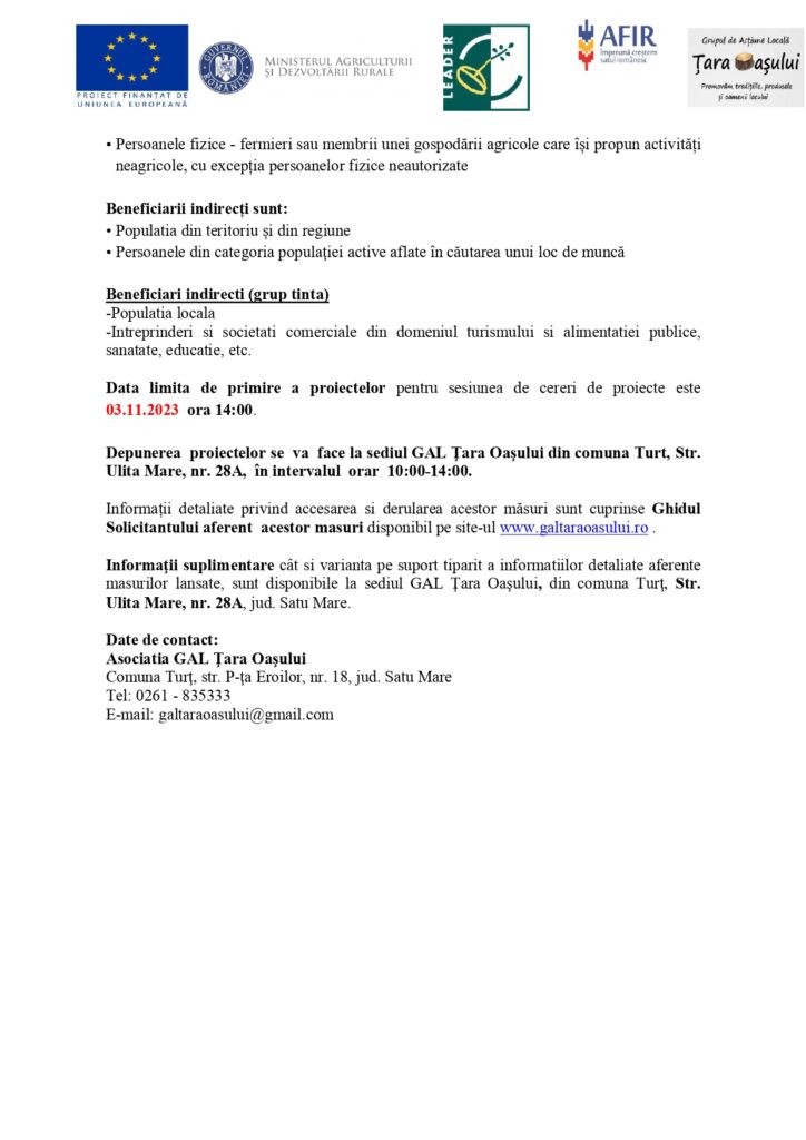 Informaţii suplimentare cât si varianta pe suport tiparit a informatiilor detaliate aferente masurilor lansate, sunt disponibile la sediul GAL Ţara Oaşului, din comuna Turţ, Str. Ulita Mare, nr. 28A, jud. Satu Mare.