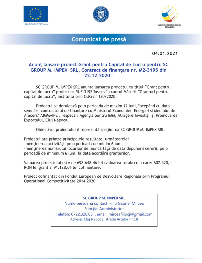 SC GROUP M. IMPEX SRL anunta lansarea proiectul cu titlul ”Grant pentru capital de lucru” proiect nr RUE 3195 înscris în cadrul Măsurii ”Granturi pentru capital de lucru”, instituită prin OUG nr 130/2020.