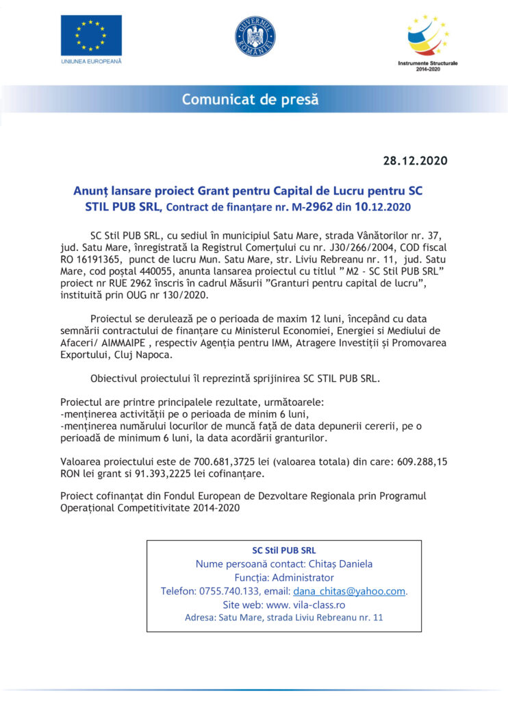 SC Stil PUB SRL, cu sediul în municipiul Satu Mare, strada Vânătorilor nr. 37, jud. Satu Mare, înregistrată la Registrul Comerţului cu nr. J30/266/2004, COD fiscal RO 16191365, punct de lucru Mun. Satu Mare, str. Liviu Rebreanu nr. 11, jud. Satu Mare, cod poștal 440055, anunta lansarea proiectul cu titlul ” M2 – SC Stil PUB SRL” proiect nr RUE 2962 înscris în cadrul Măsurii ”Granturi pentru capital de lucru”, instituită prin OUG nr 130/2020.