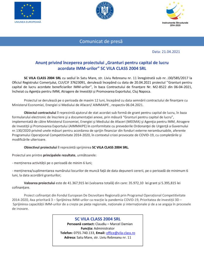 SC VILA CLASS 2004 SRL cu sediul în Satu Mare, str. Liviu Rebreanu nr. 11 înregistrată sub nr. J30/585/2017 la Oficiul Registrului Comerţului, CUI/CIF 37623091, derulează începând cu data de 20.04.2021 proiectul ’’Granturi pentru capital de lucru acordate beneficiarilor IMM-urilor’’, în baza Contractului de finanțare Nr. M2-8522 din 06-04-2021, încheiat cu Agenția pentru IMM, Atragere de Investiții și Promovarea Exportului, Cluj Napoca.