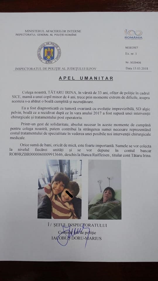 Tataru Irina, ofiter in cadrul Serviciului de Investigare a Crimelor Economice, se lupta cu o boala necrutatoare si are nevoie de ajutorul nostru. Tinerei, mama a unui copil de 4 ani, i s-a gasit o tumora ovariana, a carei evolutie este imprevizibila. Vara trecuta a fost supusa unei interventii chirurgicale, insa boala a recidivat.