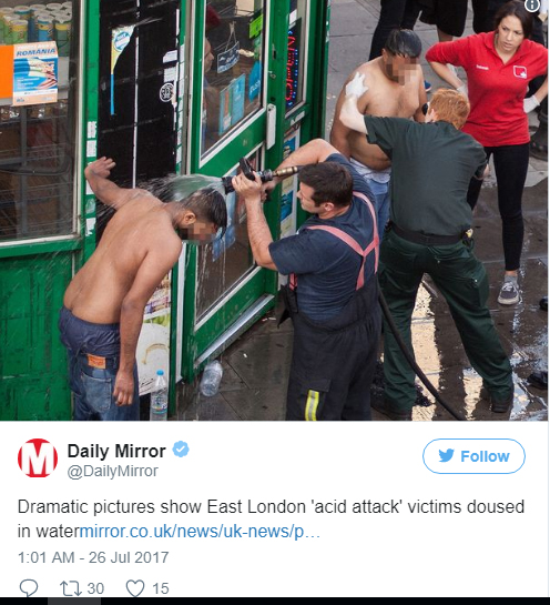 Pe Twitter circulă un videoclip cu cei doi adolescenţi, în care unul îşi toarnă apă pe faţă şi piept, în timp ce este ajutat de paramedici, iar al doilea primeşte îngrijiri medicale pe trotuar. Un jurnalist a explicat că atacul a avut loc lângă un magazin de cartier, la doar două minute de staţia de metrou şi lângă secţiile de poliţie şi pompieri din Bethnal Green, arata news.ro