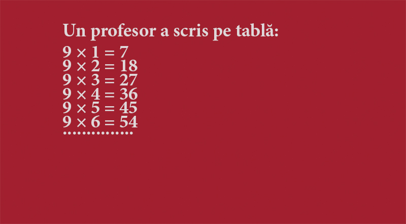 După ce a scris acestea pe tablă, profesorul s-a uitat la elevii săi și i-a văzut pe toți răzând din cauza primei înmulțiri greșite.