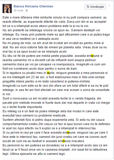 Iată mai jos postarea integrală a Biancăi: