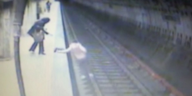 În imagini se vede cum tânara de 25 de ani a fost împinsă, în timp ce se uita în telefonul mobil şi a căzut pe şine în momentul în care trenul ieşea din tunel.