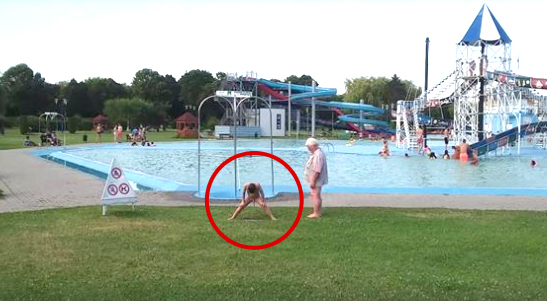 Băiatul își face nevoile nestingherit, în văzul lumii, în plin ștrand, în timp ce alte persoane se află în bazin sau pe iarbă, scrie presa locală. Chiar dacă un trecător l-a filmat cu telefonul, nimeni nu a spuns nimic și nimeni nu i-a atras atenția băiatului că așa nu se face în public, cu atât mai puțin la strand, atât de aproape de apa în care oamenii se bălăcesc. Ba chiar un adult se pare că stă și „îl supraveghează” în timp ce a defecat pe iarbă.