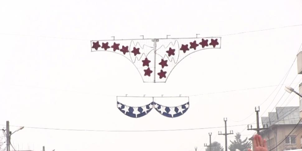 Ghirlandele cu beculeţe din oraşul Filiaşi (judeţul Dolj) au o formă care aduce cu cea a unor chiloţi, potrivit fotografiilor prezentate de site-ul Pagina Olteniei.