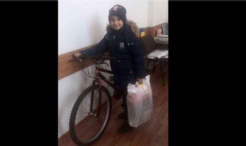 Doru a primit bucuros sacoşa cu dulciuri, apoi i-au dat lacrimile când şi-a luat în primire vehiculul cu două roţi.