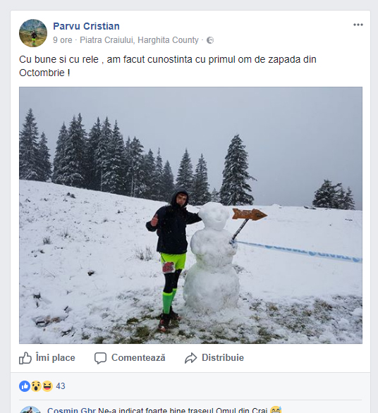 Parvu Cristian, a postat o fotografie făcută în Piatra Craiului, cu mesajul. „Cu bune si cu rele, am facut cunostinta cu primul om de zapada din Octombrie!”