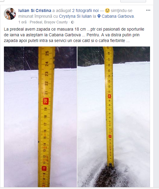 „La predeal avem zapada ce masuara 18 cm …ptr cei pasionati de sporturile de iarna va asteptam la Cabana Garbova … Pentru. A va distra putin prin zapada apoi puteti intra sa servici un ceai cald si o cafea fierbinte ..”, a scris un utilizator.