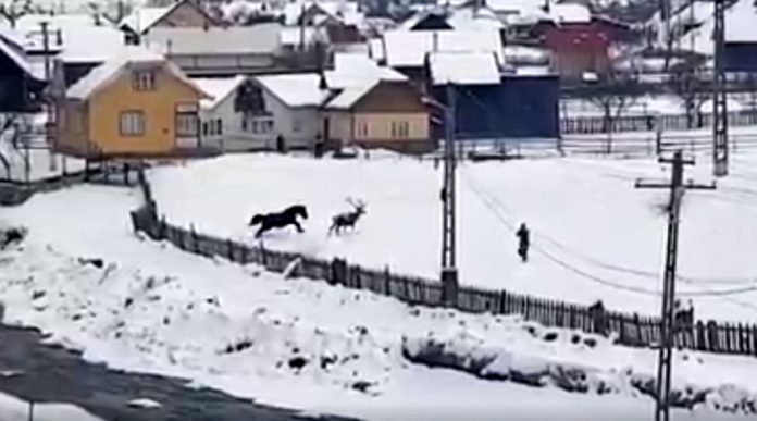 „Scenă inedita surprinsă de colegii noștri de la Ocolul #Silvic #Breaza, din cadrul Direcției Silvice #Suceava. Aceștia au filmat un cerb care a pătruns accidental în curtea unei persoane fizice și care și-a găsit, ca partener de alergat, un cal aparținând persoanei în cauză. Niciunul din cele două animale nu a fost rănit, iar cerbul a fugit în pădure”, a transmis Romsilva.