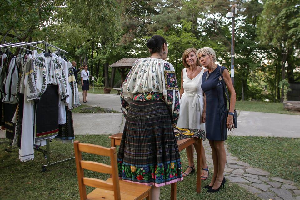 Ținuta primei doamne a Franței, o rochiță scurtă, albastru închis, a fost accesorizată cu fermoare, iar Carmen Iohannis a purtat o rochie albă, decupată la umeri și bufantă la talie.