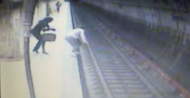 În imagini se vede cum tânara de 25 de ani a fost împinsă, în timp ce se uita în telefonul mobil şi a căzut pe şine în momentul în care trenul ieşea din tunel.
