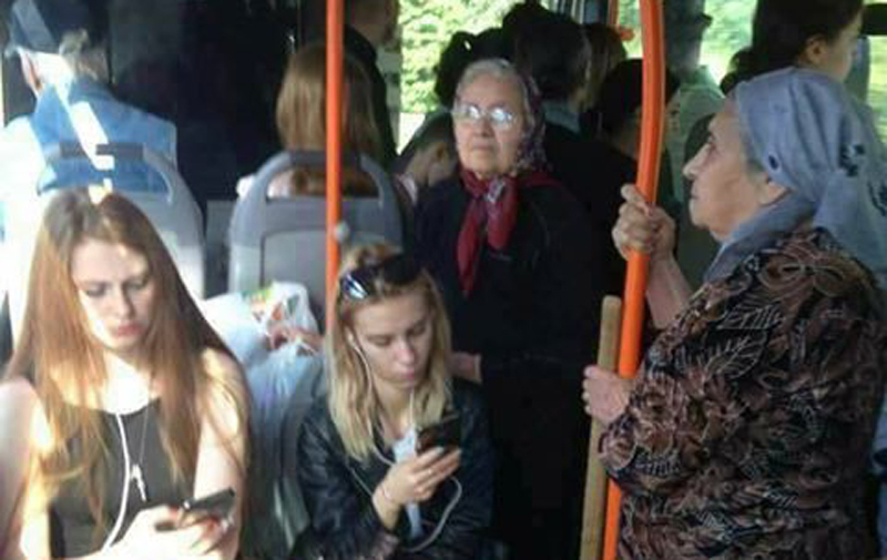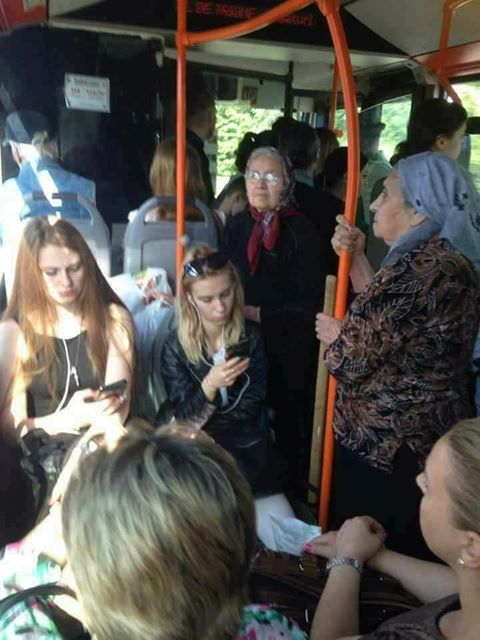 O imagine dintr-un autobuz a stârnit vii controverse pe rețeaua de socializare Facebook. Fotografia, care a fost realizată într-un mijloc de transport în comun din România a fost intens comentată, mai ales că se pot vedea două femei trecute de prima tinerețe care stau in picioare. În același timp, mai multe tinere stau confortabil pe scaunele din autobuz, ceea ce i-a determinat pe mulți să spună despre este că sunt fără bun simț și fără cei șapte ani de acasă.