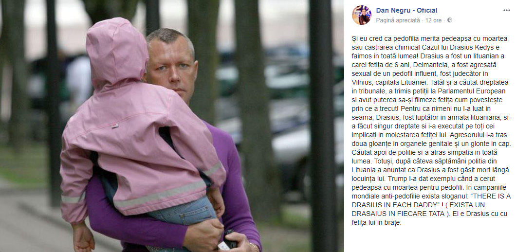 In campaniile mondiale anti-pedofilie exista sloganul: “THERE IS A DRASIUS IN EACH DADDY” ! ( EXISTA UN DRASAIUS IN FIECARE TATA ). El e Drasius cu cu fetița lui in brațe”, a scris Dan Negru pe pagina personala de Facebook.