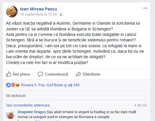 „Ati vazut reactia negativa a Austriei, Germaniei si Olandei la solicitarea lui Junker ca UE sa admita Romania si Bulgaria in Schengen? Asta pentru ca le convine ca Romania executa toate obligatiile in cadrul Schengen, fara a se bucura si de beneficiile sistemului pentru romani!?  Daca, presupunand, i-am lua pe toti cei care sosesc ca refugiati la mare si i-am orienta mai departe, spre tarile Schengen, motivand ca, daca tot nu ne bucuram de drepturi, de ce sa ne achitam de obligatii? Credeti ca cele trei tari si-ar modifica pozitia?”, a scris Pascu, pe Facebook.