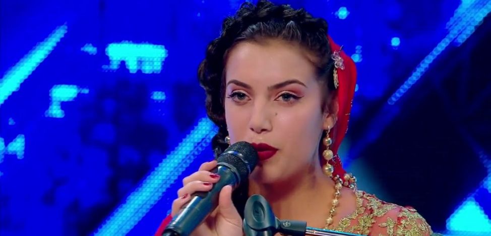 Pe scenă a urcat o tânără de etnie romă, din neam de căldărari, extrem de frumoasă şi îmbrăcată în costum tradiţional, care a reuşit să-i cucerească pe membrii juriului.